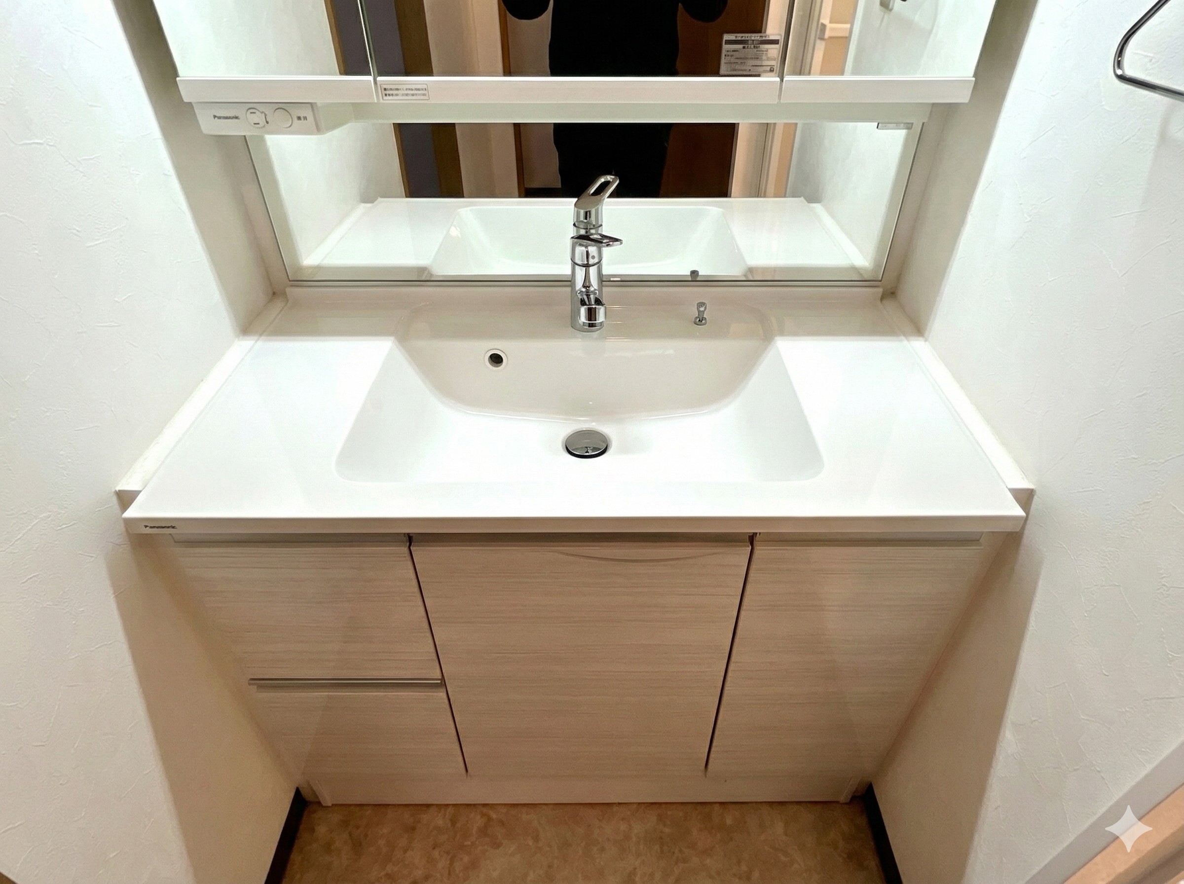 リフォーム済み 洗面台。 洗面化粧台は収納力のあるタイプで、 日常使いに十分な機能を備えています